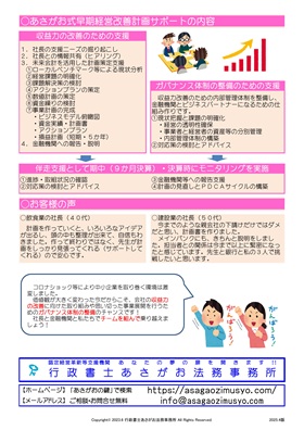過去の取り組み実績を元に、私たちオリジナルの「あさがお式早期経営改善計画書」として作成 いたします。